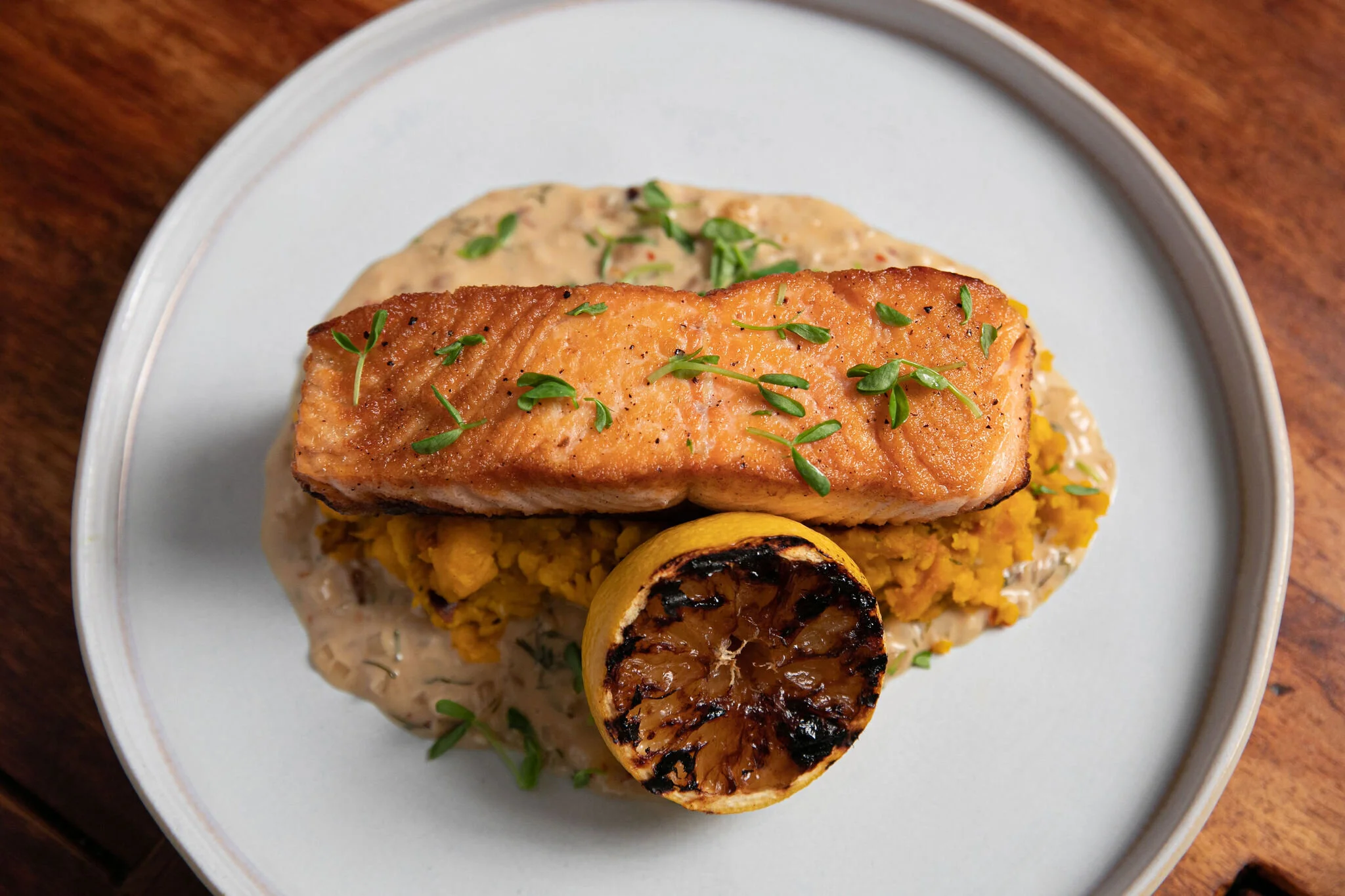 My favorite way to serve this salmon is with Kabocha squash puree. If you create a squash “island” for the salmon to rest on it allows the skin to stay crisp above the sauce! Here is my simple recipe for an absolutely delicious Kabocha Mash.